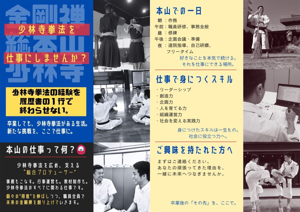 本山では2027年度採用の職員(拳士指導職)を募集いたします。拳士指導職とは、事務全般のほか、研修会・講習会・儀式行事等の企画、運営、及び教えと技法の指導者として業務に携わる“少林寺拳法の総合プロデューサー”です。